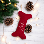Available in Red or Blush Pink, these soft velvet stockings are shaped like a dog bone and make the perfect addition to your holiday décor.